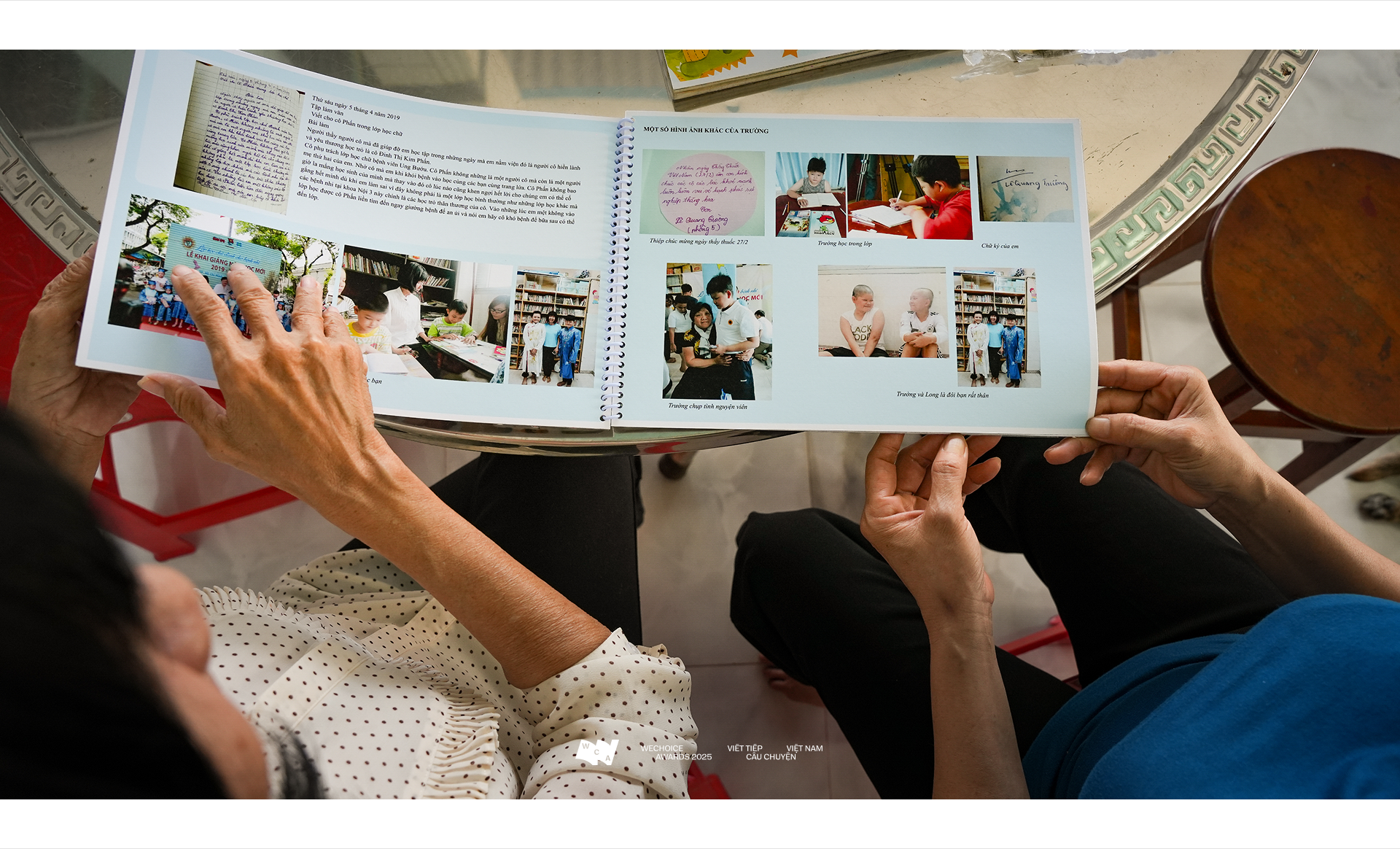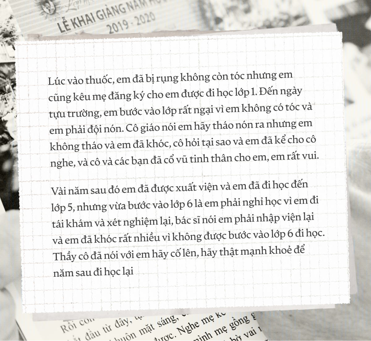 số bệnh nhân, mà là một con người với đầy đủ ước mơ và danh tính. Có em chưa từng được đến lớp, có em đi học được vài buổi thì lại phải về phòng bệnh, que truyền dài đong đưa giữa cổ tay áo. Có em tay vẫn cắm kim truyền mà vẫn ngồi