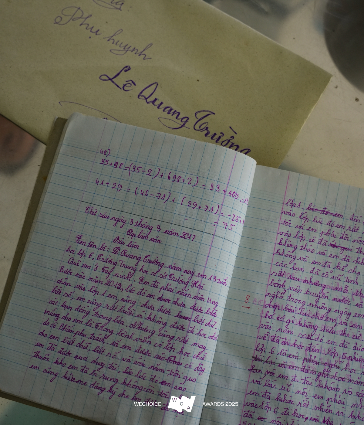 Ở trong chiếc túi giấy của cô là những bức hình, cuốn vở, những nét chữ được lưu giữ nắn nót của Lê Quang Trường. Trường là một cậu bé có đôi má phúng phính và một nụ cười rất đáng yêu, cũng là học sinh của cô trong suốt hơn 10 năm chiến