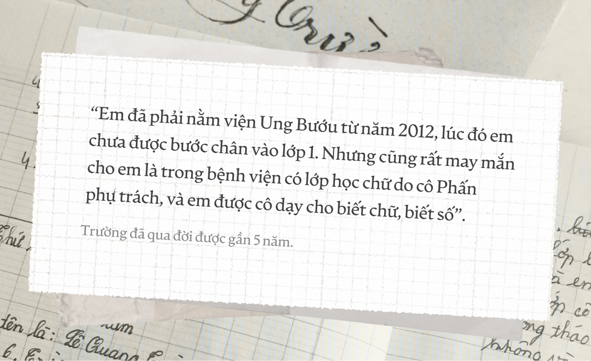 Đó là những dòng chữ được nắn nót viết trong tập vở của Lê Quang Trường, một học sinh trong lớp học cho bệnh nhi ung thư của cô Đinh Thị Kim Phấn. Lớp học đặc biệt được mở từ năm 2009, đón các em học sinh là bệnh nhân của bệnh viện Ung